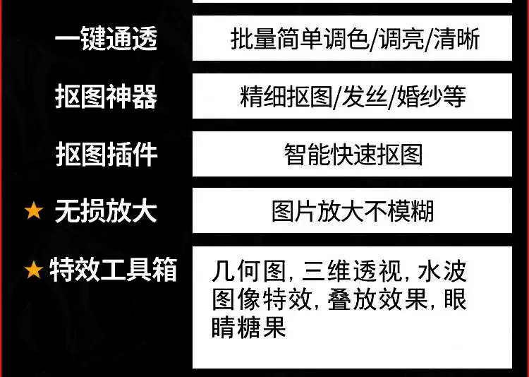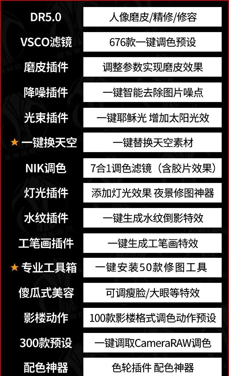 这是一套全新的更全面的ps插件套装~此套插件包含260多款插件,设计无压力。 此插件套装涉及:磨皮,调色,一键换天空,丁达尔光效,水波纹,工笔画,配色,抠图,无损放大… 比较多,就不一一介绍了,大家懂得懂得。