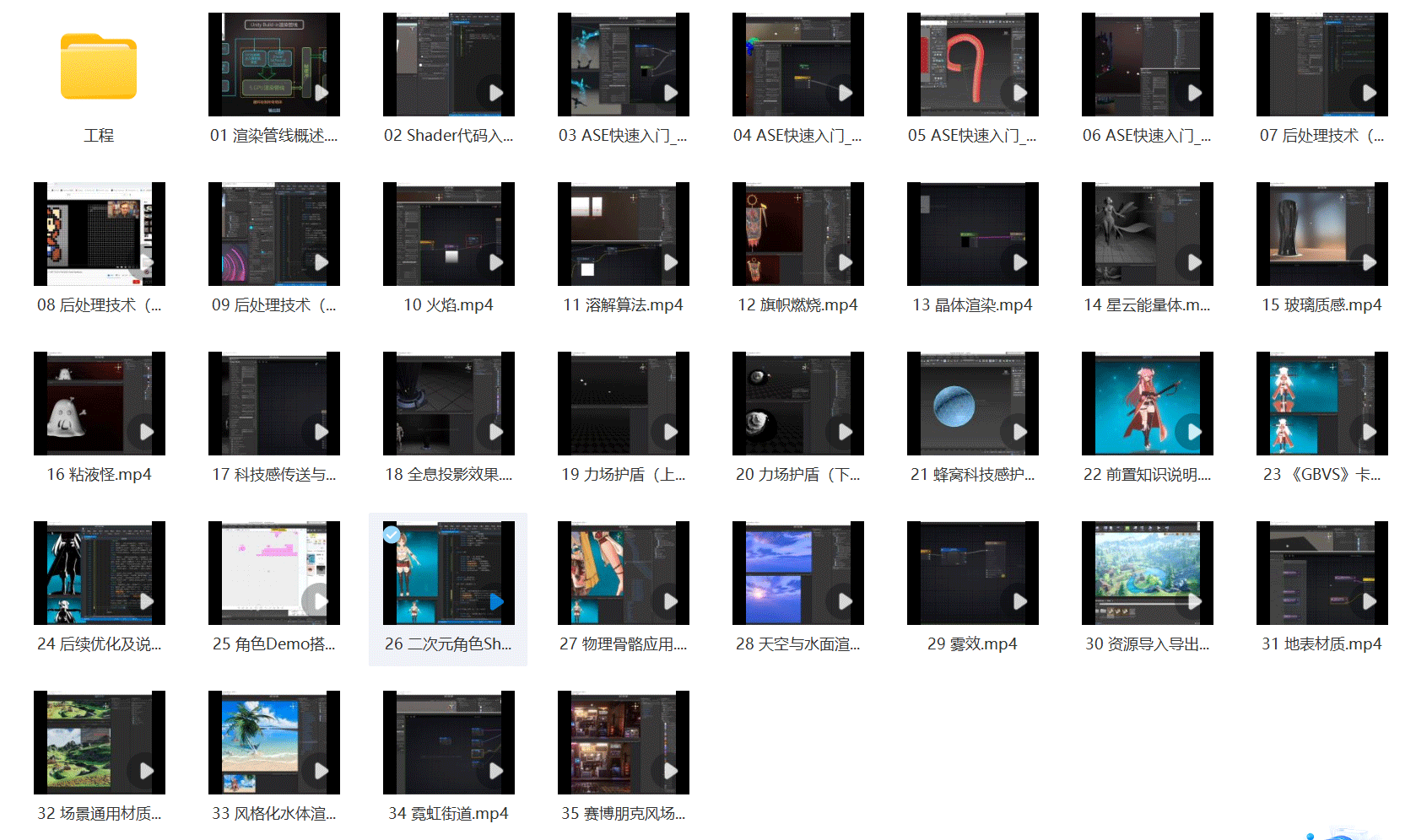 课程包含:渲染管理与Shader入门、Shader基础:光照技术、角色渲染、后处理技术/屏幕特效、火焰、燃烧、晶体渲染、玻璃质感、人物渲染、风格化场景、赛博朋克风场景等等