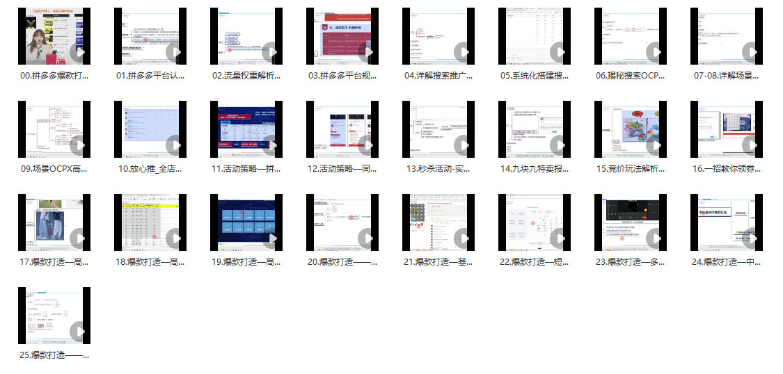 玺承云的《拼多多爆款打造实战特训营》是一套旨在帮助学员在拼多多平台上打造爆款商品的实战课程。这个课程内容丰富,覆盖了从入门到高手的不同层次,旨在通过理论和实战相结合的方式,帮助学员全面掌握拼多多平台的运营技巧。