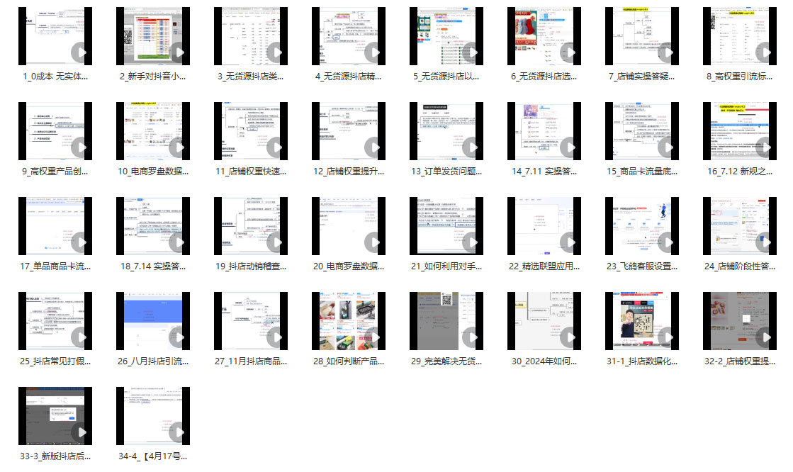 课程内容分为34个部分,例如“0成本无实体地址办理营业执照”、“新手对抖音小店基础认知提高”、“无货源抖店类目分析与选择”、“无货源抖店精细化选品”等,每一部分都提供了详细的操作指南和实用技巧。此外,课程还包括了如何处理订单发货问题和售后相关处理方案,以及如何应对抖店常见打假套路和防范措施等内容。