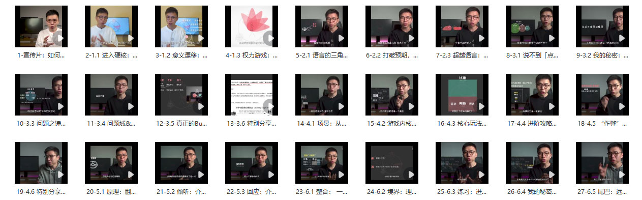 课程包括多个部分,例如宣传片、语言的三角测量、问题之锤、场景分析、游戏内核等。每个部分都有详细的视频讲解,例如“如何说清楚一件复杂的事”、“语言世界的物理法则”、“倾听回应观的重塑”等。课程旨在帮助学员深入理解沟通的本质,并提供实用的技巧来提升沟通效果。