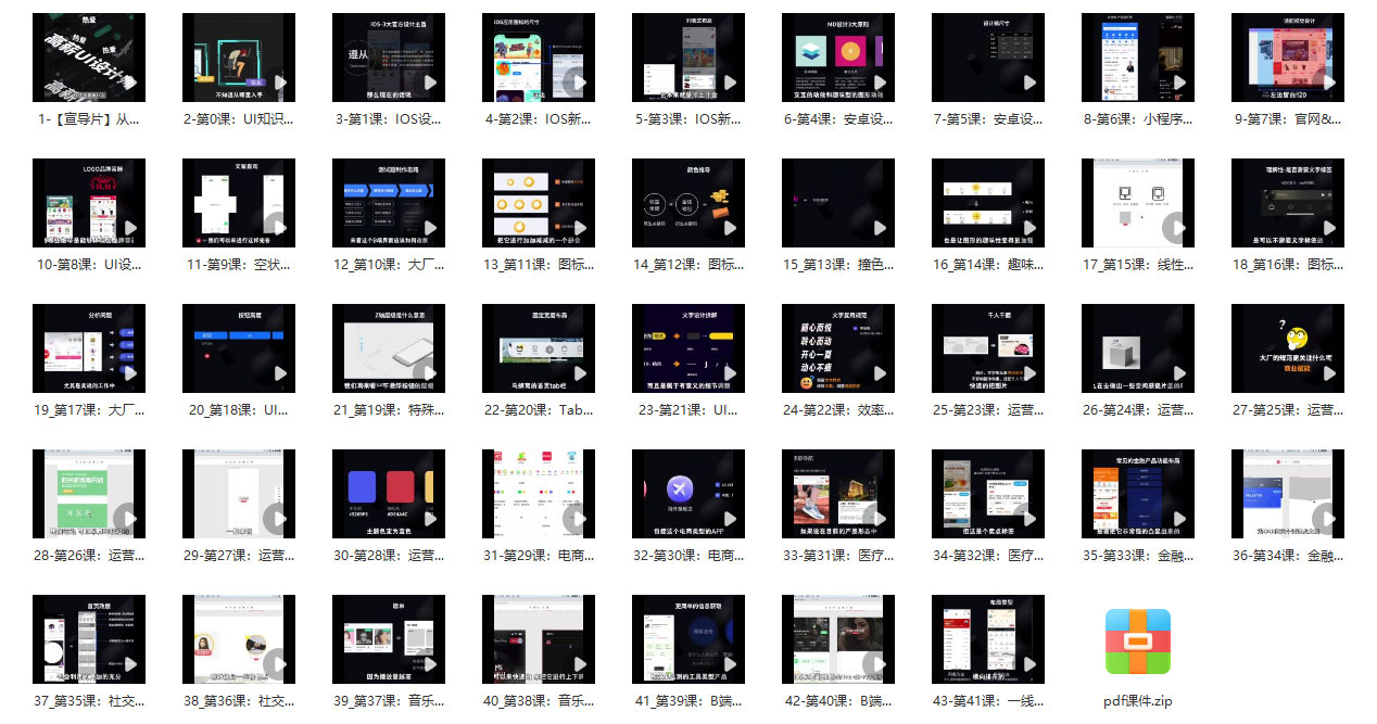 课程内容包括但不限于iOS和安卓设计规范、小程序设计规范、官网和B端后台设计规范、UI设计的趣味性(如IP融入和品牌延展)、空状态设计、图标设计、UI按钮设计、特殊按钮设计、标签设计法则、电商、医疗、金融和社交行业UI界面改版等。每个部分都通过案例分析和实践操作来帮助学生理解和掌握设计技巧。
