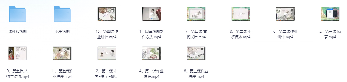 课程内容包括如何绘制春季主题的水墨画小场景,以及ipad相关的绘画技巧和风格。